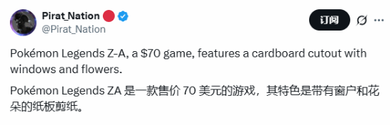 《宝可梦传说:Z-A》现已正式发售在Switch 2与Switch平台发售,游戏里的一些建模遭到了部分玩家的吐槽。日前融可赢,推主@Pirat_Nation发推晒出了游戏里两处较为明显的模型,吐槽道:“《宝可梦传说:Z-A》售价70美元,游戏内含带窗户和花朵图案的纸板立体场景。”
