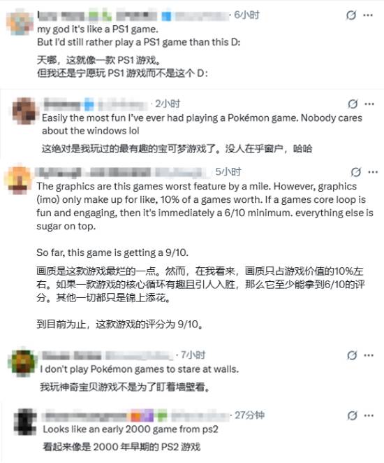这两张图片随即吸引众多玩家前来围观,一些玩家认同@Pirat_Nation的观点,认为以《宝可梦传说:Z-A》的售价而言,出现这样的情况确实很糟糕:“看起来像是2000年早期的PS2游戏。”“《宝可梦传说:Z-A》最多只值40美元。”也有玩家进行了反驳,认为《宝可梦传说:Z-A》以游戏性为卖点,出现这种画面问题无伤大雅。